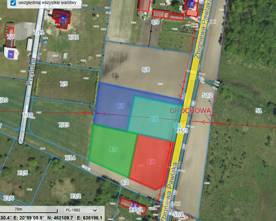 Działki objęte są MPZP części wsi Grochowa (Uchwała 92/VI/2011 z dnia 2011-03-25). Publikacja: DZ. URZ. WOJ. MAZ. Nr 82 poz. 2650 -można budować domy wolnostojące. Szczegóły znajdują się na stronie: piaseczno.e-mapa.net - w polu szukaj należy wpisać numer działki lub adres: Zbigniewa Pawlaka 36.